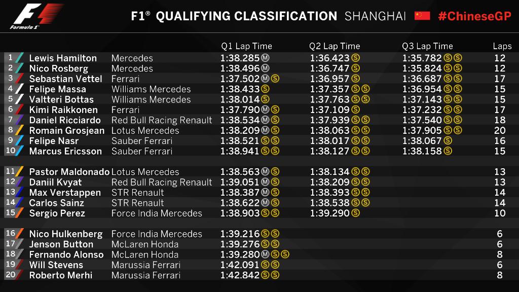 Nico Rosberg ise takım arkadaşının yalnızca 0.042 saniye gerisinde ikinci sırada kalarak takımı adına ilk çizgiyi kapatan isim olmuş oldu.